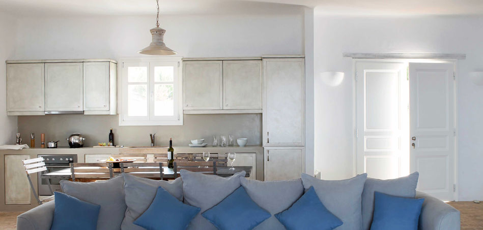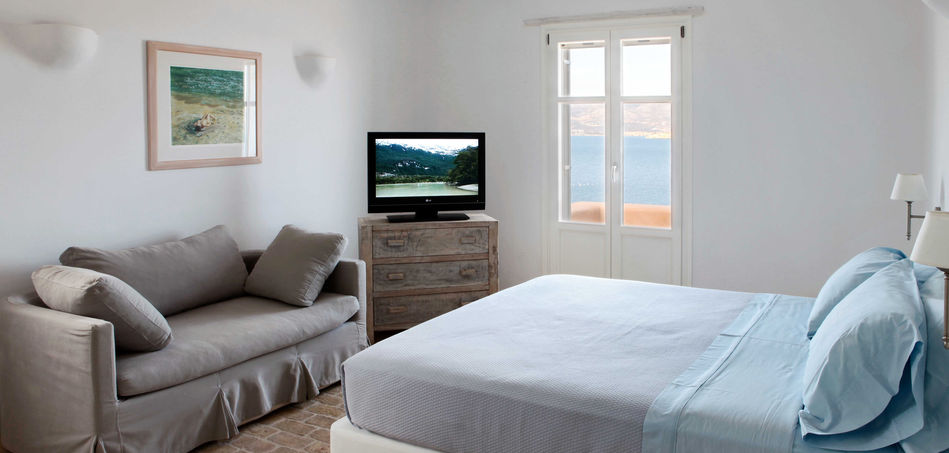 Indoors, the Villa is tastefully decorated and can easily accommodate up to 10 guests in its five luxurious bedrooms. The living room that is situated on the Villa’s first floor offers guest a relaxing and comfortable setting, with its light colors, terracotta tile floors, fire place and open plan kitchen. A double bedroom with sea views and private bathroom and a master bedroom of similar comfort, are situated on the Villa’s first floor, while two more, equally luxurious and elegantly decorated bedrooms can be found on the Villa’s lower level.